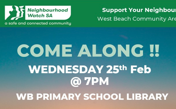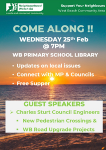 Be informed about your local West Beach Community – Next Neighbourhood Watch meeting 25th of Feb